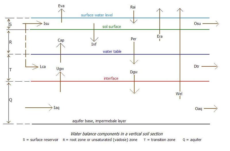 The agricultural water balances are calculated for each soil reservoir separately. The excess water leaving one reservoir is converted into incoming water for the next reservoir. The three soil reservoirs can be assigned different thickness and storage coefficients, to be given as input data. When, in a particular situation the transition zone or the aquifer is not present, they must be given a minimum thickness of 0.1 m.